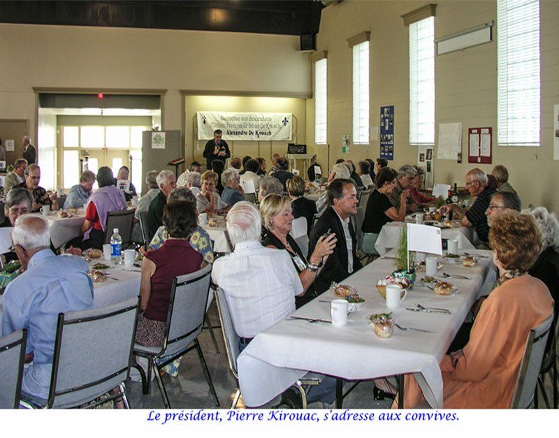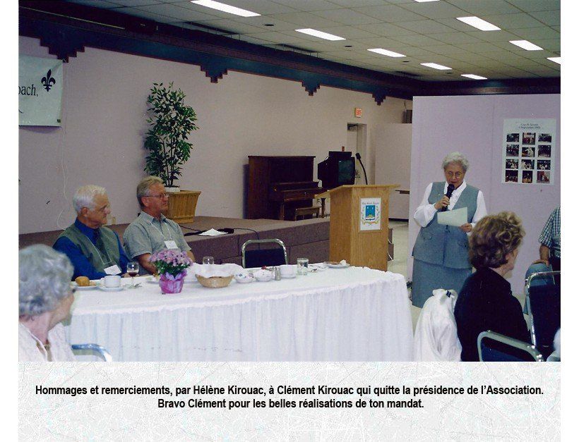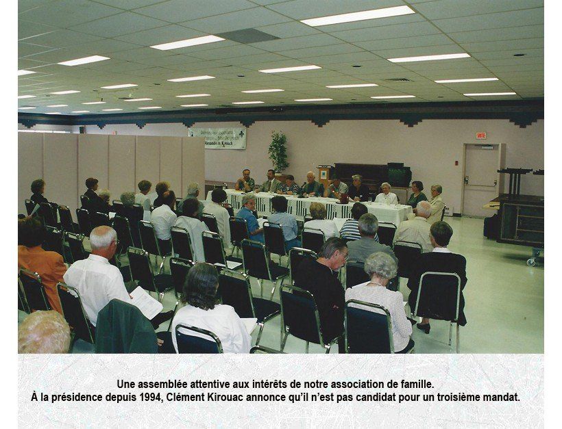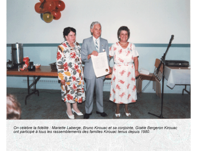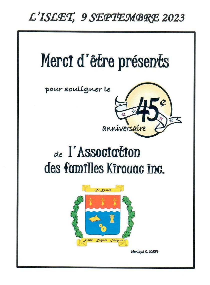 l’incomparable dévouement de notre président, François Kirouac, et son engagement dans l’Association depuis les débuts en 1978 dont ses dix-huit ans de présidence, la publication du livre « L’Ancêtre des familles Kirouac en Amérique, son épouse et leurs fils », la recherche généalogique (sa base de données comprend 15 351 descendants d’Alexandre de Kervoach (9 950 conjoints) et 49 202 fichiers), les publications annuelles de la revue « Le Trésor des Kirouac » depuis 2001, la maintenance du site Web de l'Association et dernièrement, la recherche des ancêtres par l’ADN. La liste pourrait s’allonger et de beaucoup. Les associations de famille tombent les unes après les autres, si la nôtre est encore, non seulement debout, mais bien vivante, c’est en très grande partie à toi, François, que nous le devons. MERCI !