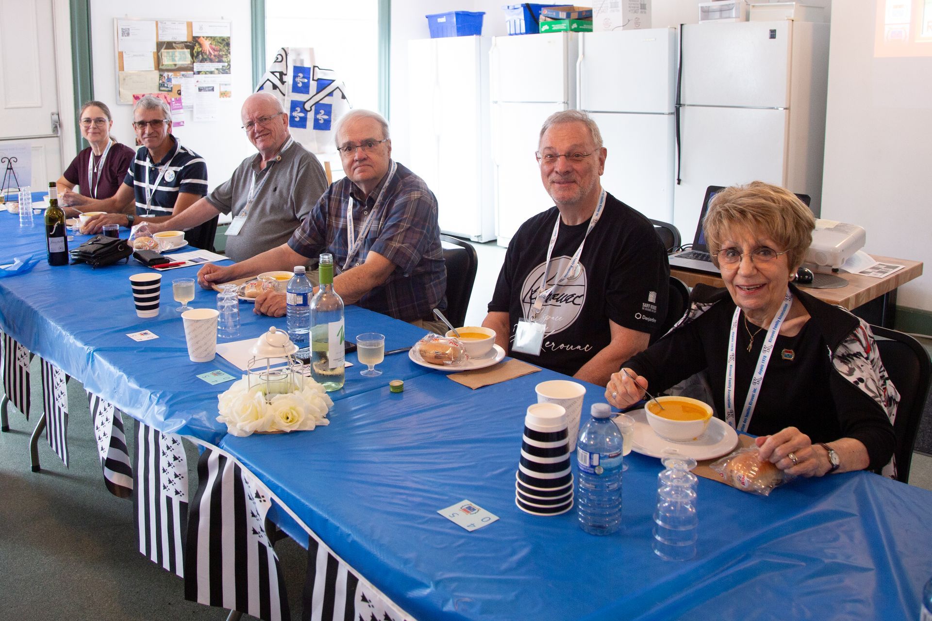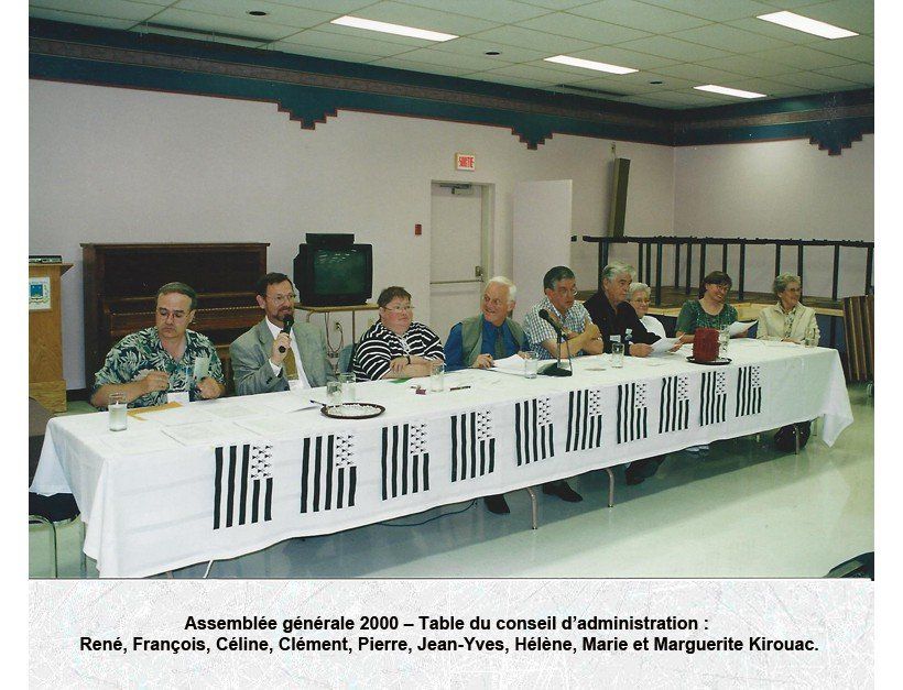 Assemblée générale des membres – Table du C.A. à partir de droite : Lucille Kirouac, Michel Bornais, Céline Kirouac-secrétaire, Pierre Kirouac, François Kirouac-président, René Kirouac-trésorier, Marie Lussier Timperley et Marie Kirouac.