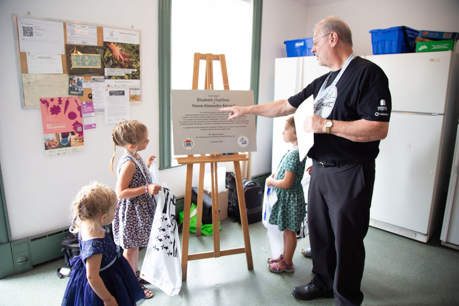 L’Islet, le lieu de notre rassemblement 2023, est une municipalité qui fait partie de notre patrimoine familial. C’est à cet endroit que Simon-Alexandre, fils aîné de l’Ancêtre s’est établi avec son épouse, Élisabeth Chalifour une native de l’Islet. La maison où elle est née se transmet de génération en génération et l’Association a obtenu la permission d'installer une plaque commémorative dans la chapelle située face à cette maison. Pour le dévoilement, François est assisté des petites filles d’André Kirouac, Arielle, Juliette et Alice. Sur la photo, on voit aussi, Étienne Kirouac avec la petite Lexie dans ses bras.