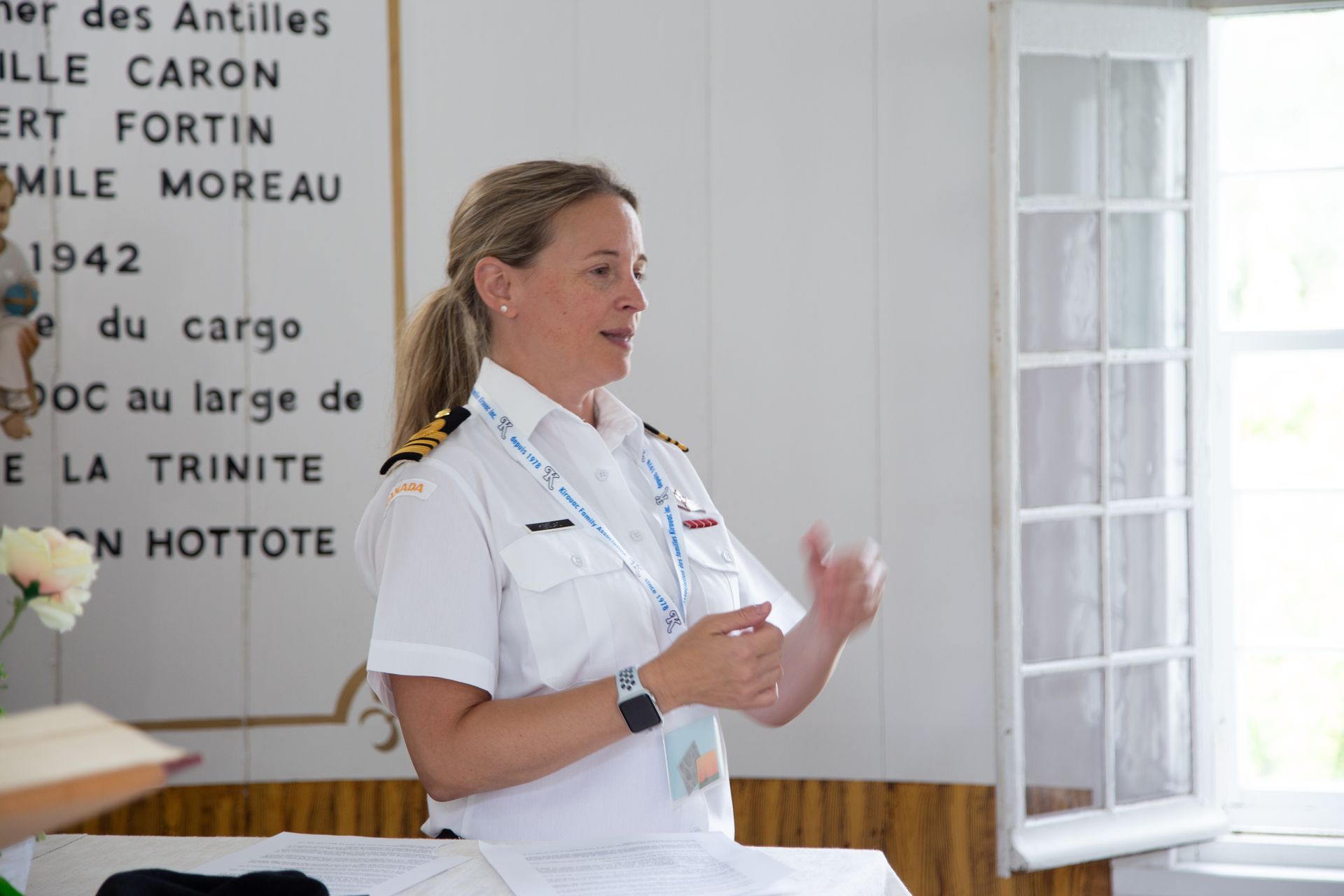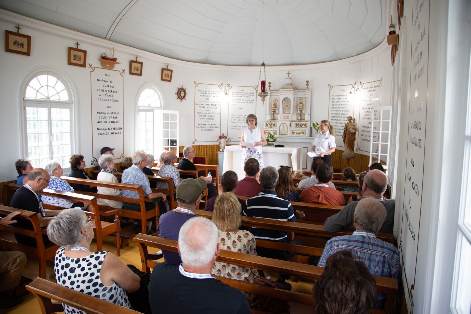 À l’intérieur de la chapelle des Marins, Sylvie Houde présente notre troisième conférencière, Caroline Kirouac.