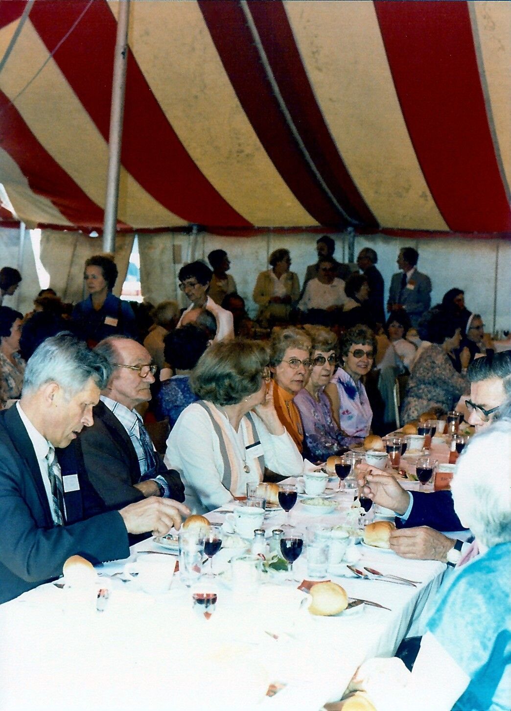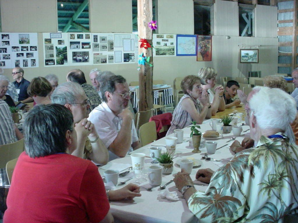 C'est l'heure du repas. Attablés, à droite, on peut reconnaître Robert Kirouac, Hectorine Hébert et Marie-Paule Normand - à la table du buffet, Alain Kirouac.