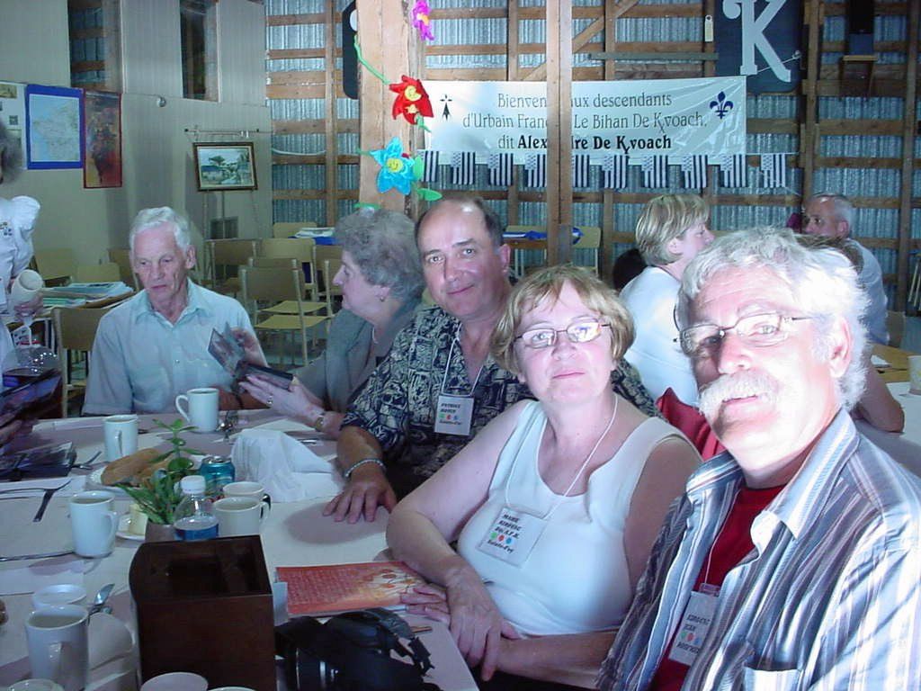 Activité importante de la journée : les deux chercheurs en généalogie : Alain Kirouac, au centre de la photo et François Kirouac que l'on devine à l'extrême droite, profitent de cette rencontre pour ajouter des informations de famille à leur banque de données.