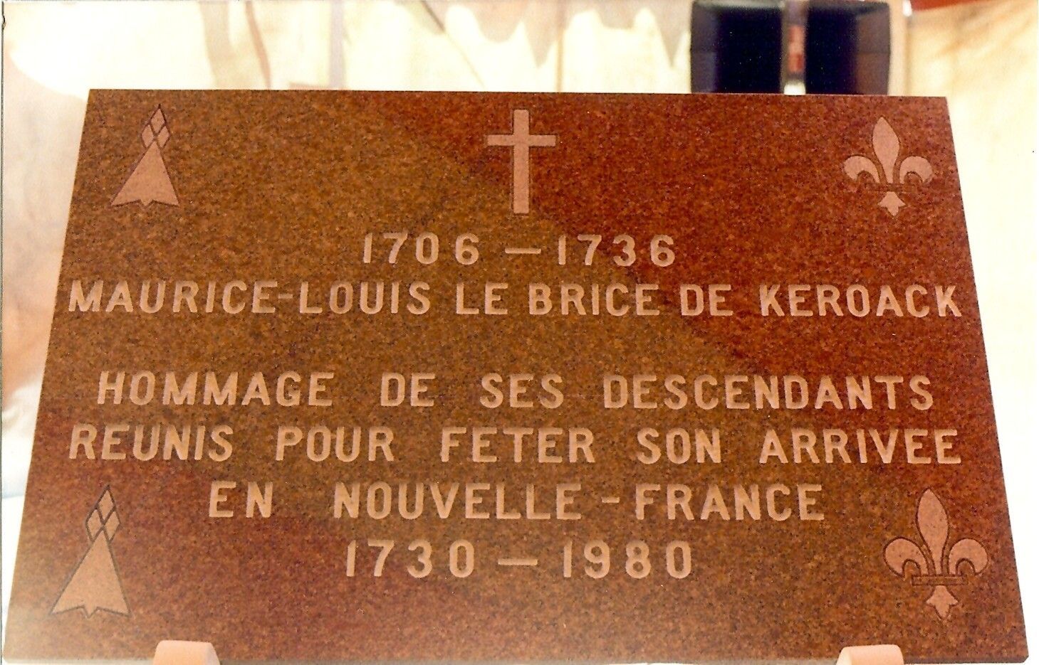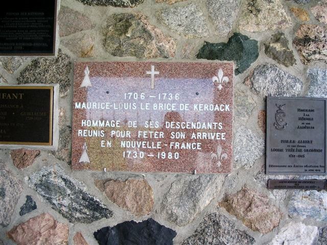 Plaque, à l’intérieur de la chapelle, dévoilée lors de la première rencontre des familles Kirouac en 1980 pour souligner le 250e anniversaire de l'arrivée d'Alexandre de Kervoach en Nouvelle-France.