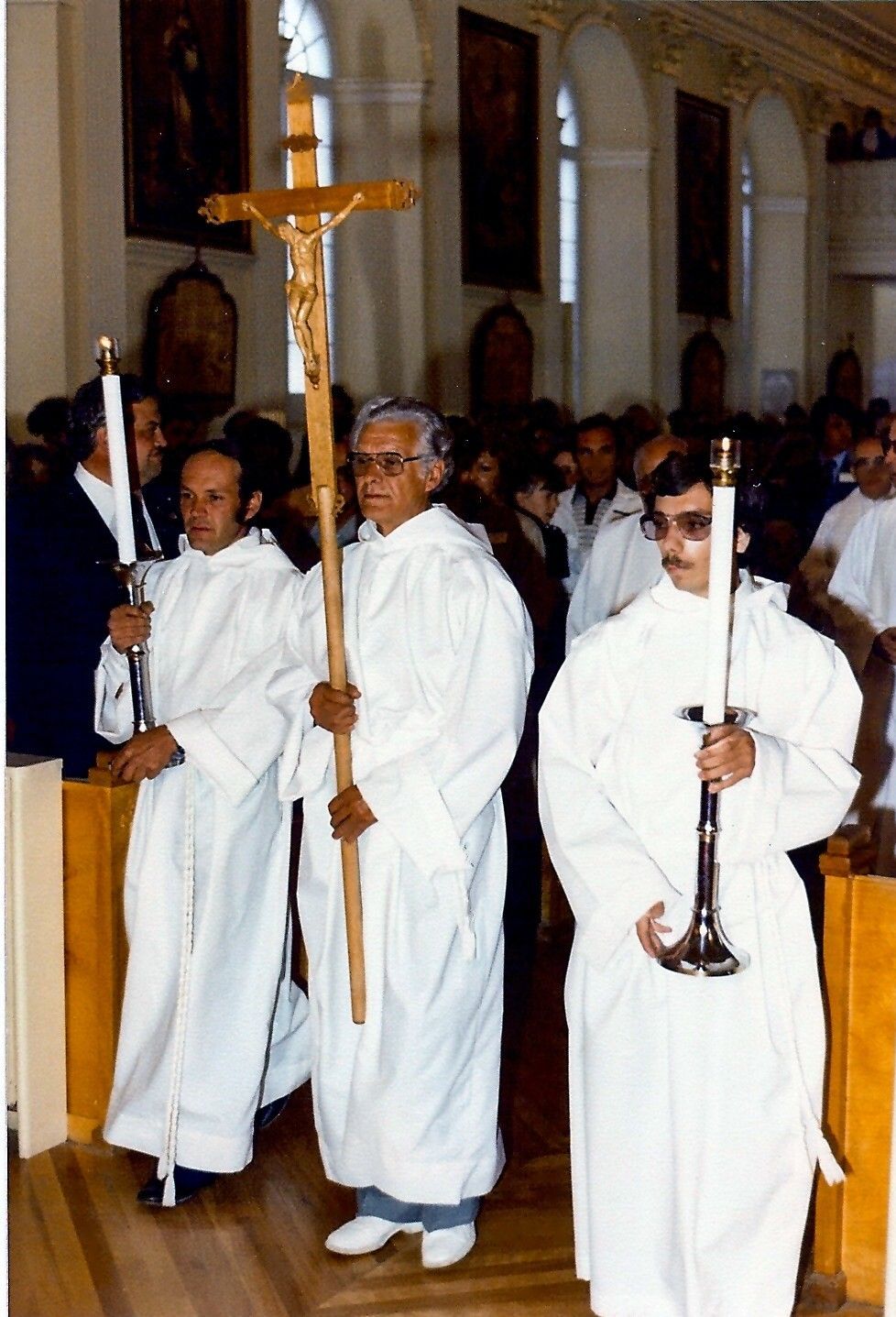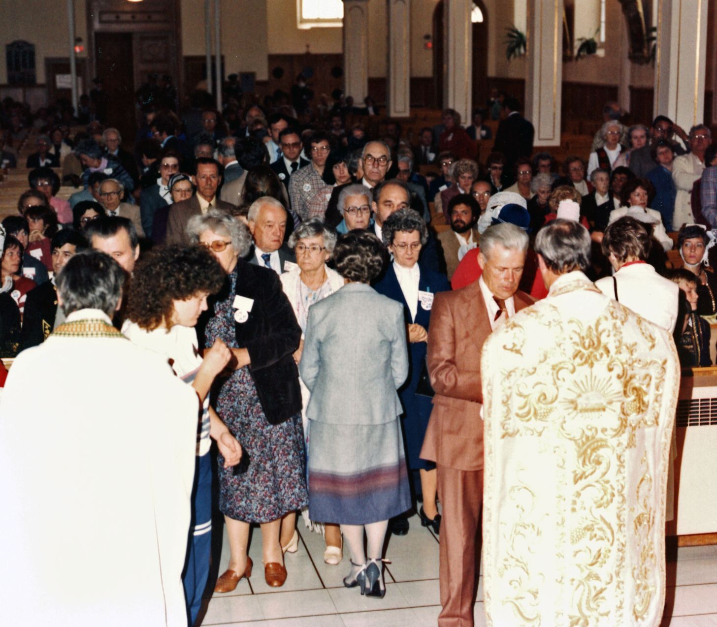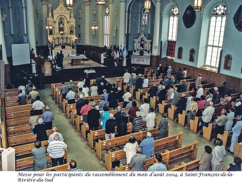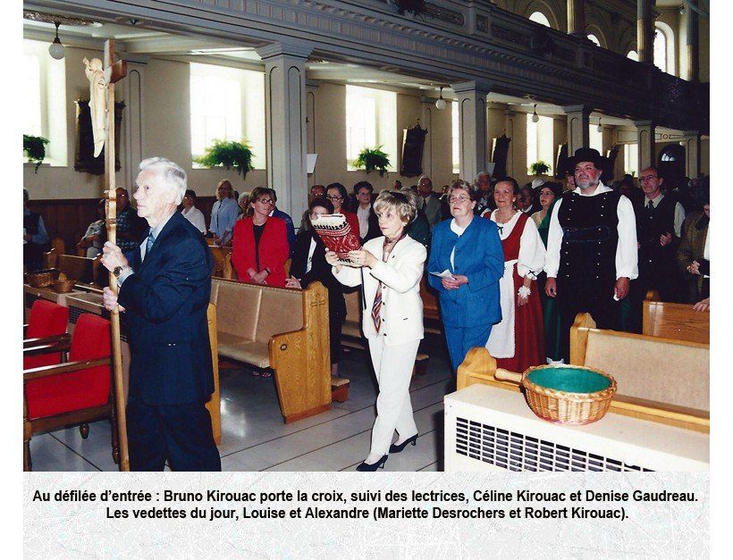 S'apprêtant à communier, à la droite de la photo, Henri Kirouac de Warwick. Au centre de la photo, portant des lunettes, on reconnaît Robert Kirouac aussi de Warwick précédé de son épouse, Lumina Labrecque, elle-même précédée de leur fils, Paul Kirouac de Brossard.