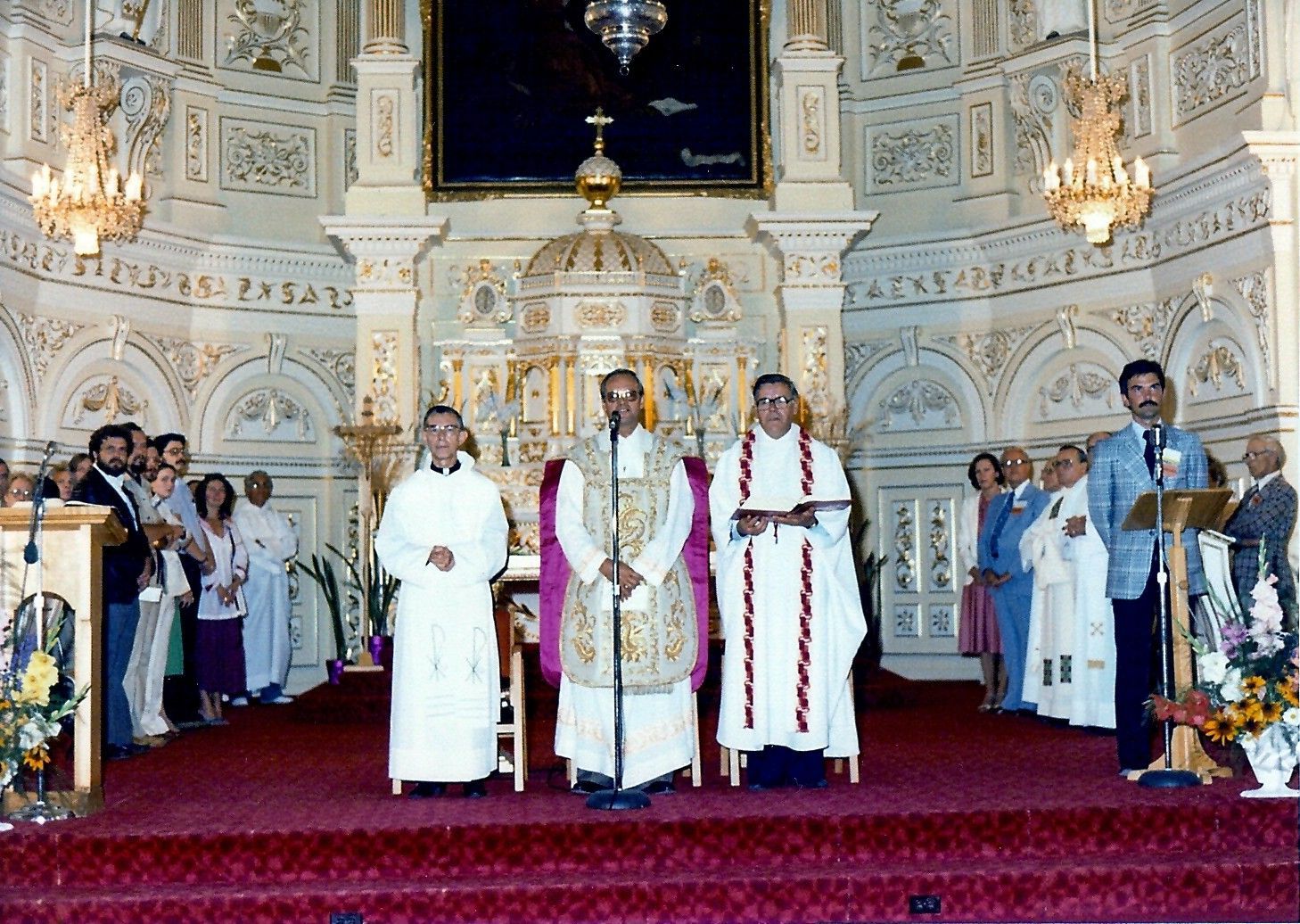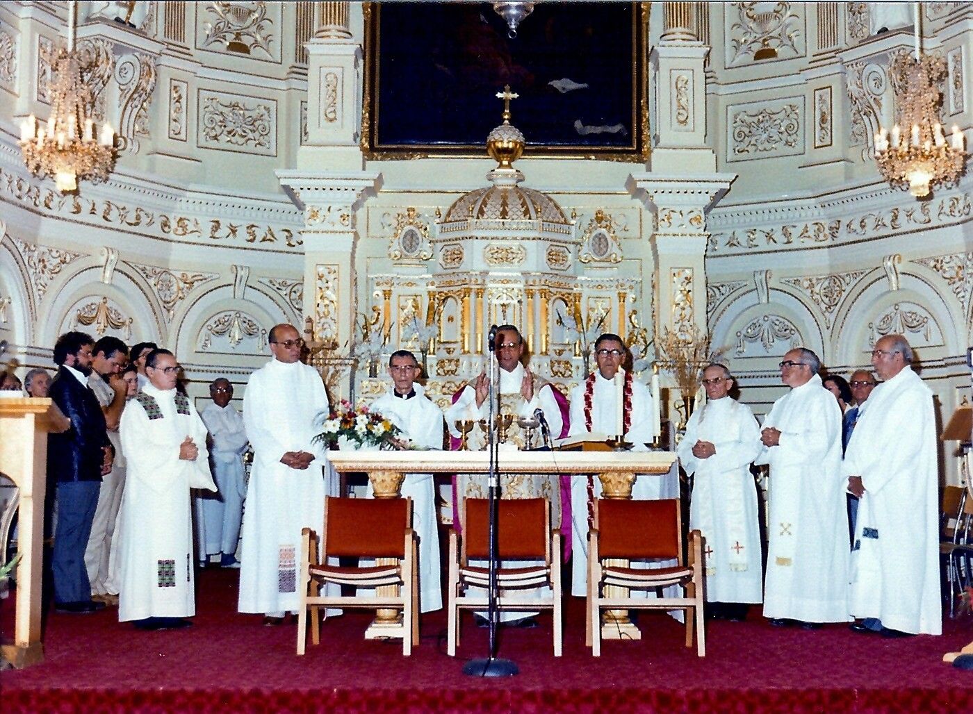 Le célébrant et les co-célébrants durant la messe du dimanche : ( ), ( ), l'abbé Gérard Lévesque, l'abbé Gaston Kirouac, l'abbé Jean-Marie DeRoy, l'abbé Adrien Lévesque, l'abbé Léon Laberge et ( ).