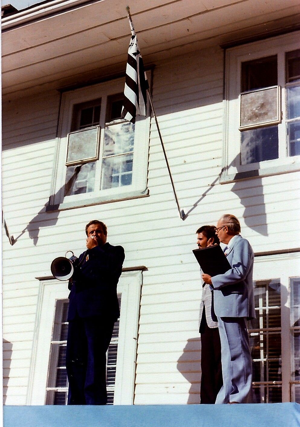 Cérémonie d'ouverture du premier rassemblement des familles Kirouac à l'Islet. De gauche à droite : le maire de L'Islet, Jean-Pierre Caron, le maître de cérémonie, René Kirouac et le président du comité organisateur, Jacques Kirouac.