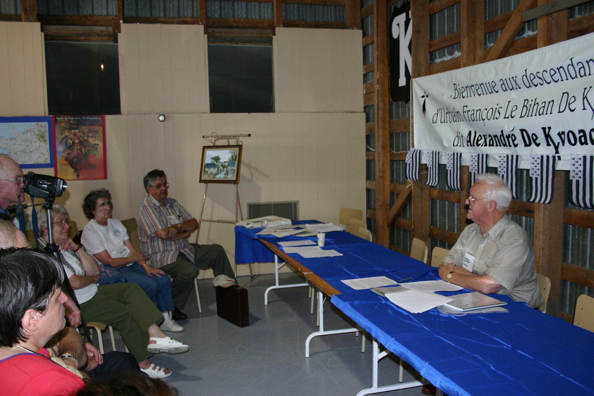 Conférence de Clément Kirouac présentant les dernières découvertes effectuées en Bretagne durant la recherche sur l'Ancêtre des familles Kirouac. Dans l'assistance, on aperçoit de gauche à droite : Sylvie Houde, Denise Gaudreault, Françoise Gaudreault et Pierre Kirouac. À la ciné-caméra: Michel Bornais.