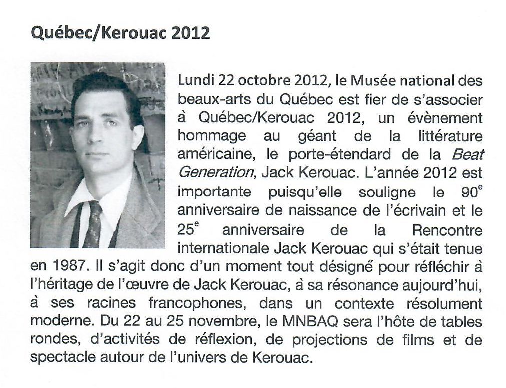 « Le pianiste de jazz, David Amram, proposera une conférence musicale où il reviendra sur son amitié avec Jack Kerouac. Ce personnage de légende à l’humour aiguisé a participé aux sessions jazz-poésie animées par Kerouac lui-même dans les années 50 et reviendra sur cette époque new-yorkaise où le be-bop s’inventait en musique dans les bars et en mots dans la tête de Kerouac ». - Tiré du programme de l’événement Québec/Kerouac 2012