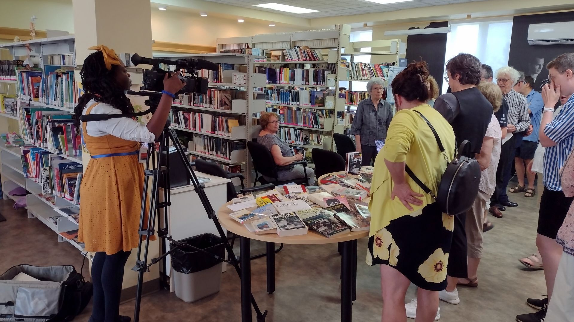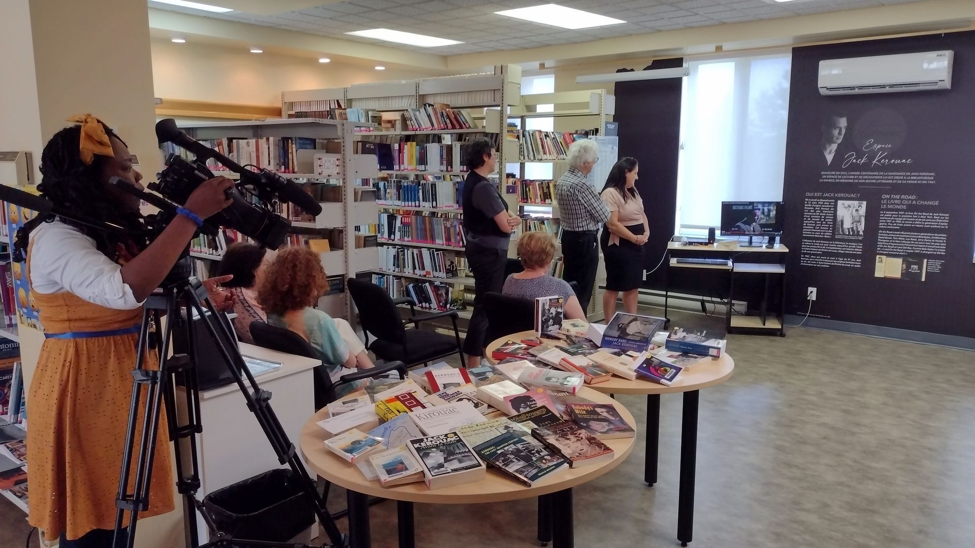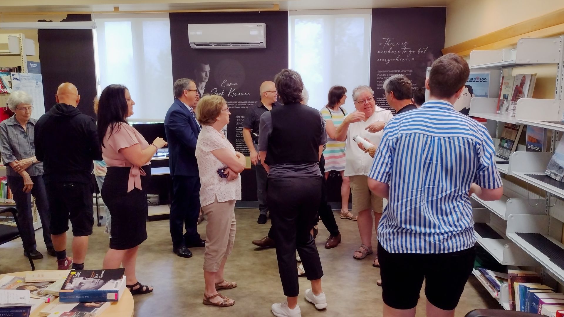 Une partie des gens présents lors de l'inauguration officielle de l'Espace Jack Kerouac à la bibliothèque La Source à Saint-Hubert-de-Rivière-du-Loup le 19 juillet 2023.