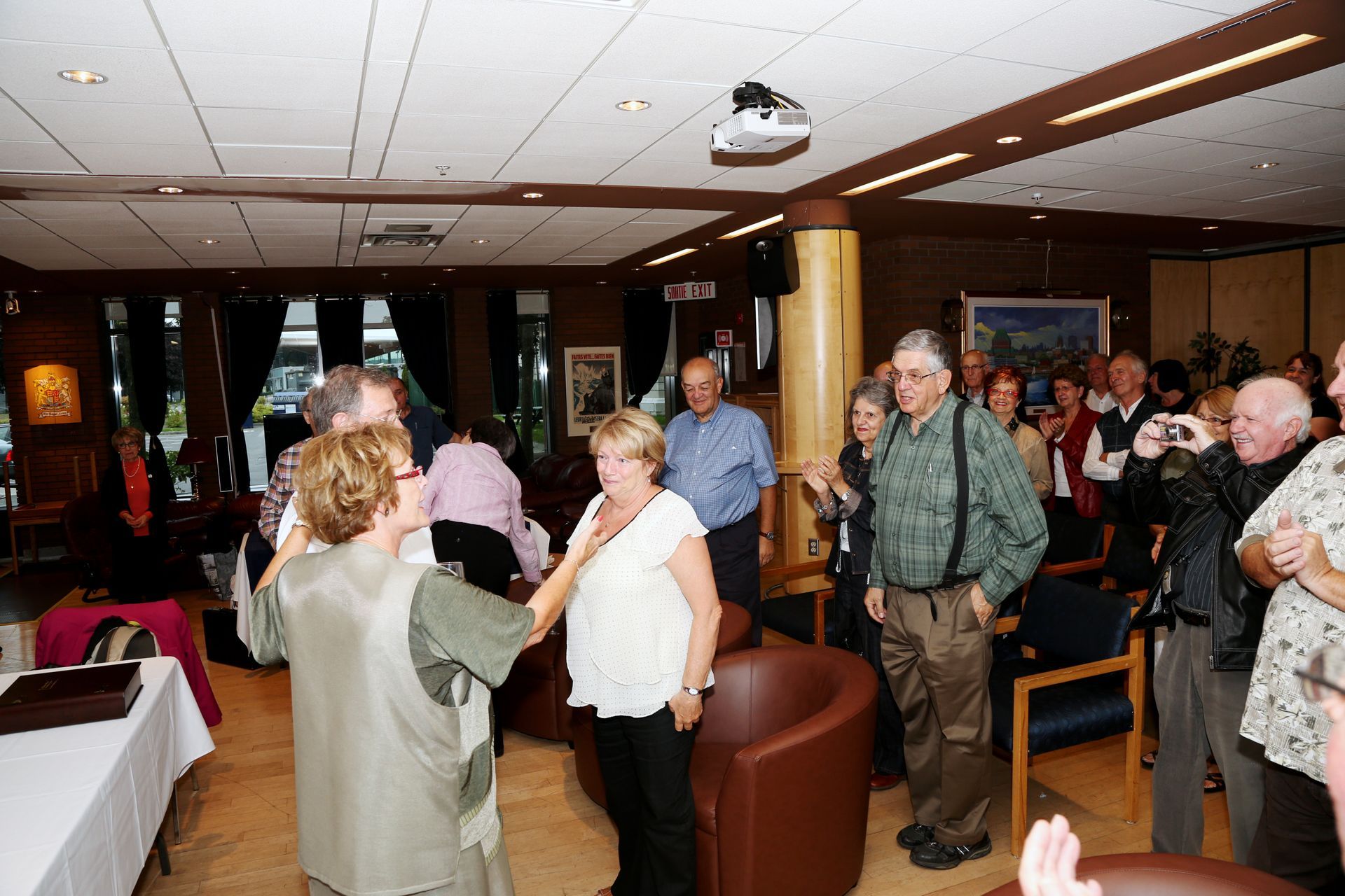 remet le drapeau de l’Association à monsieur Brunelle. Celui-ci nous montre qu’il porte déjà à la boutonnière, le logo de l’Association.