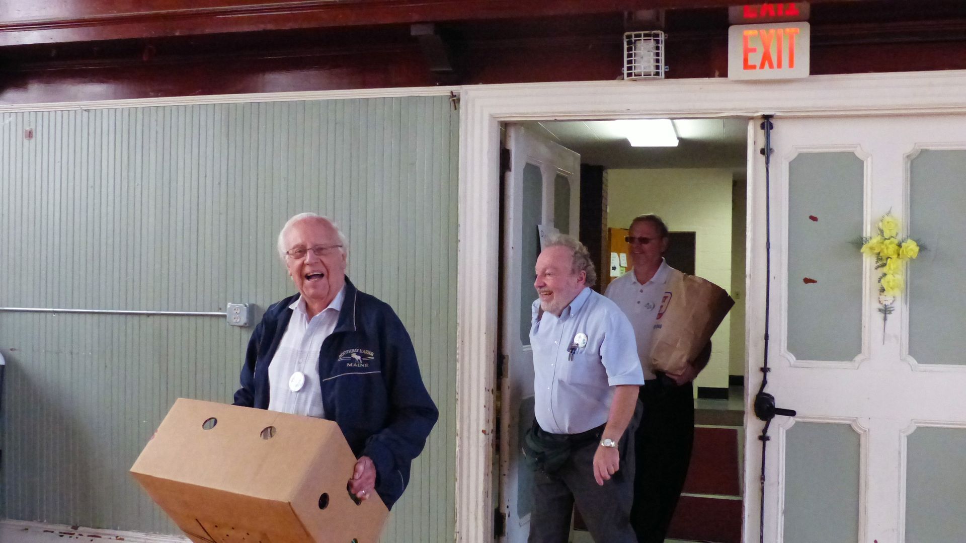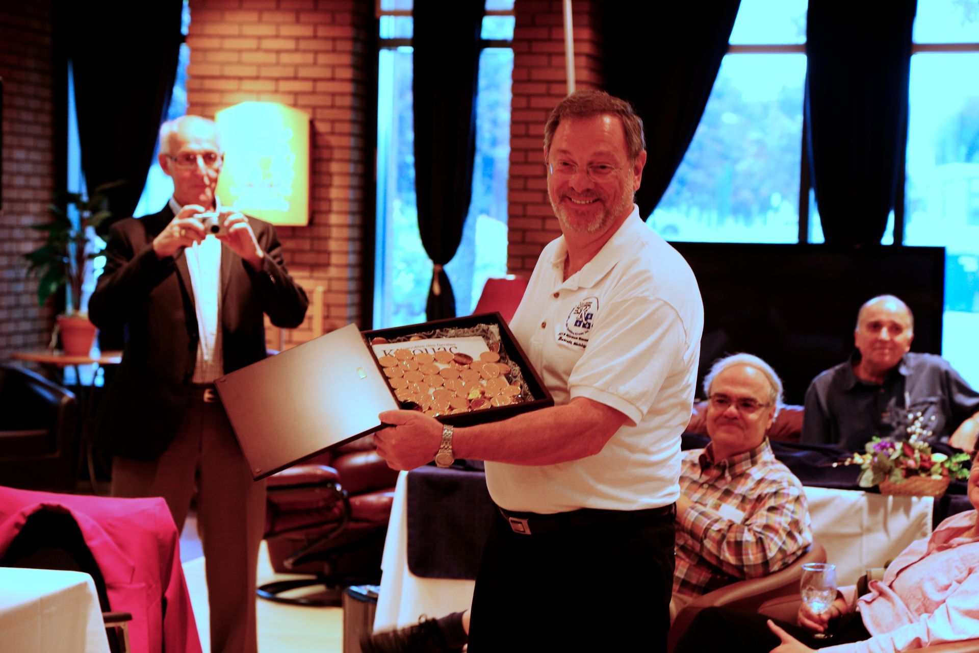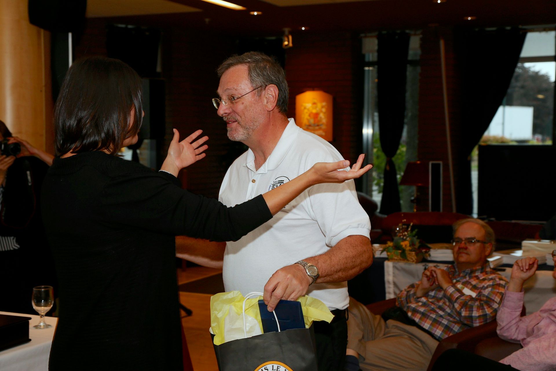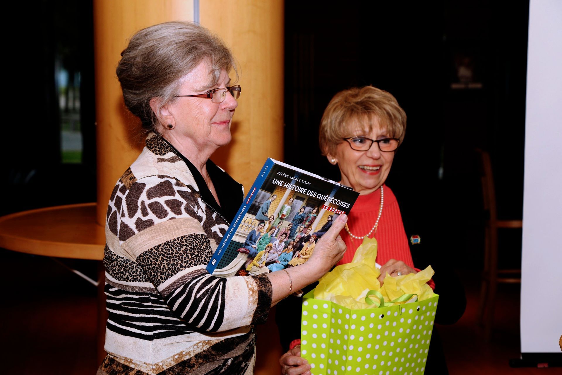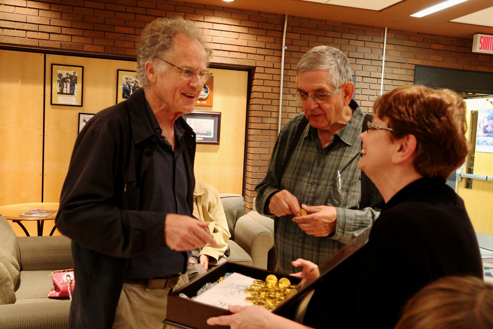 C’est aussi l’occasion d’échanges amicaux : Éric Waddell. Pierre Kirouac et Marie Kirouac qui leur offre les « pièces d’or »,