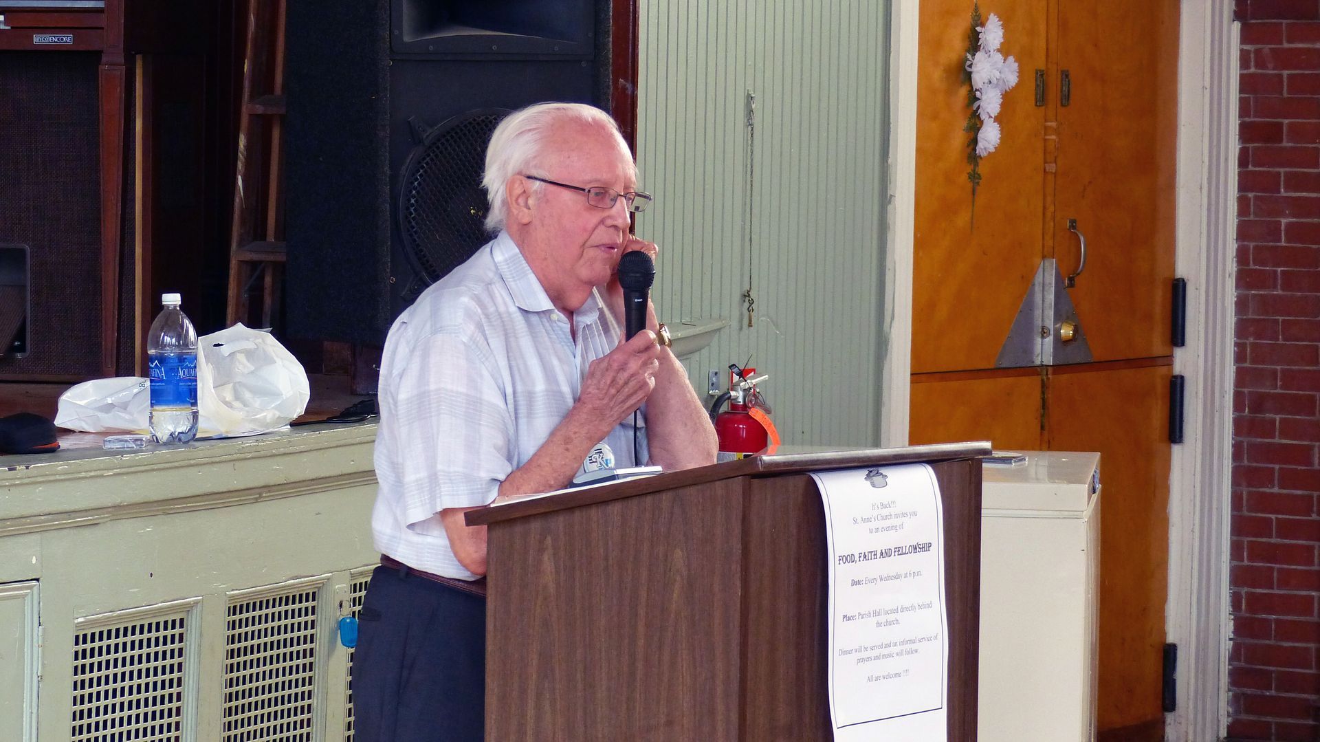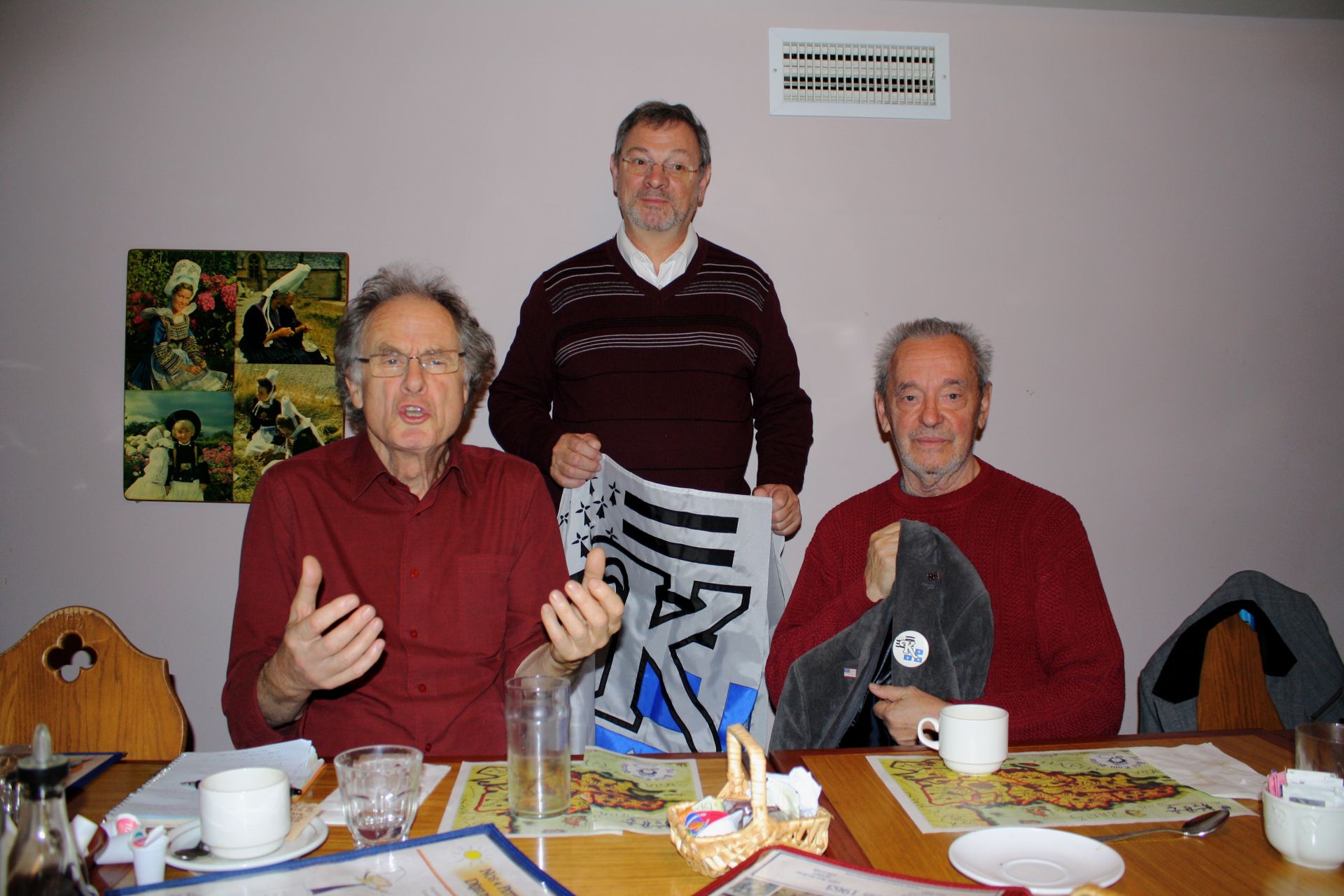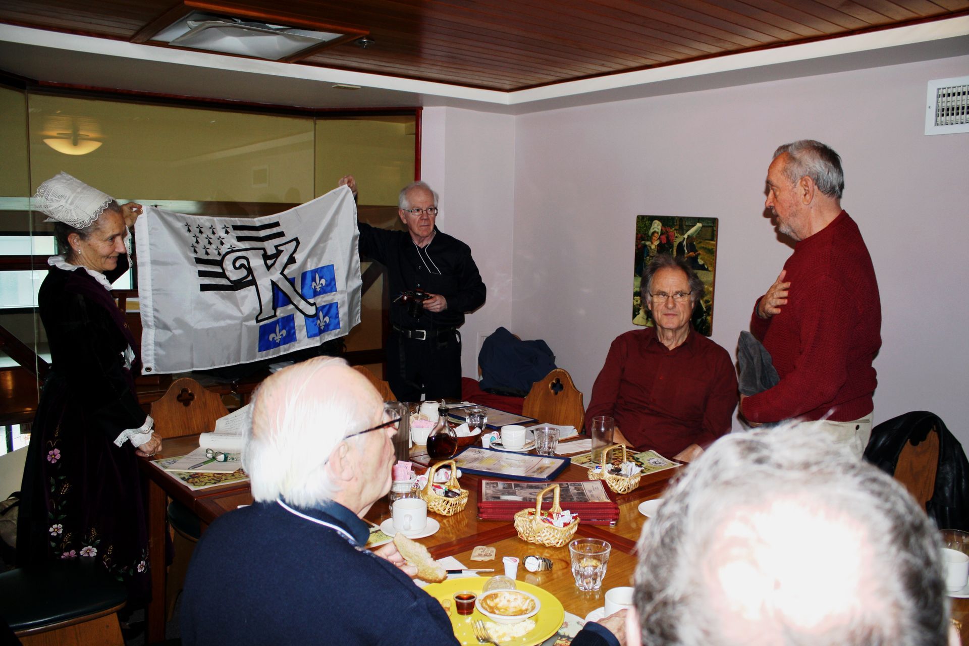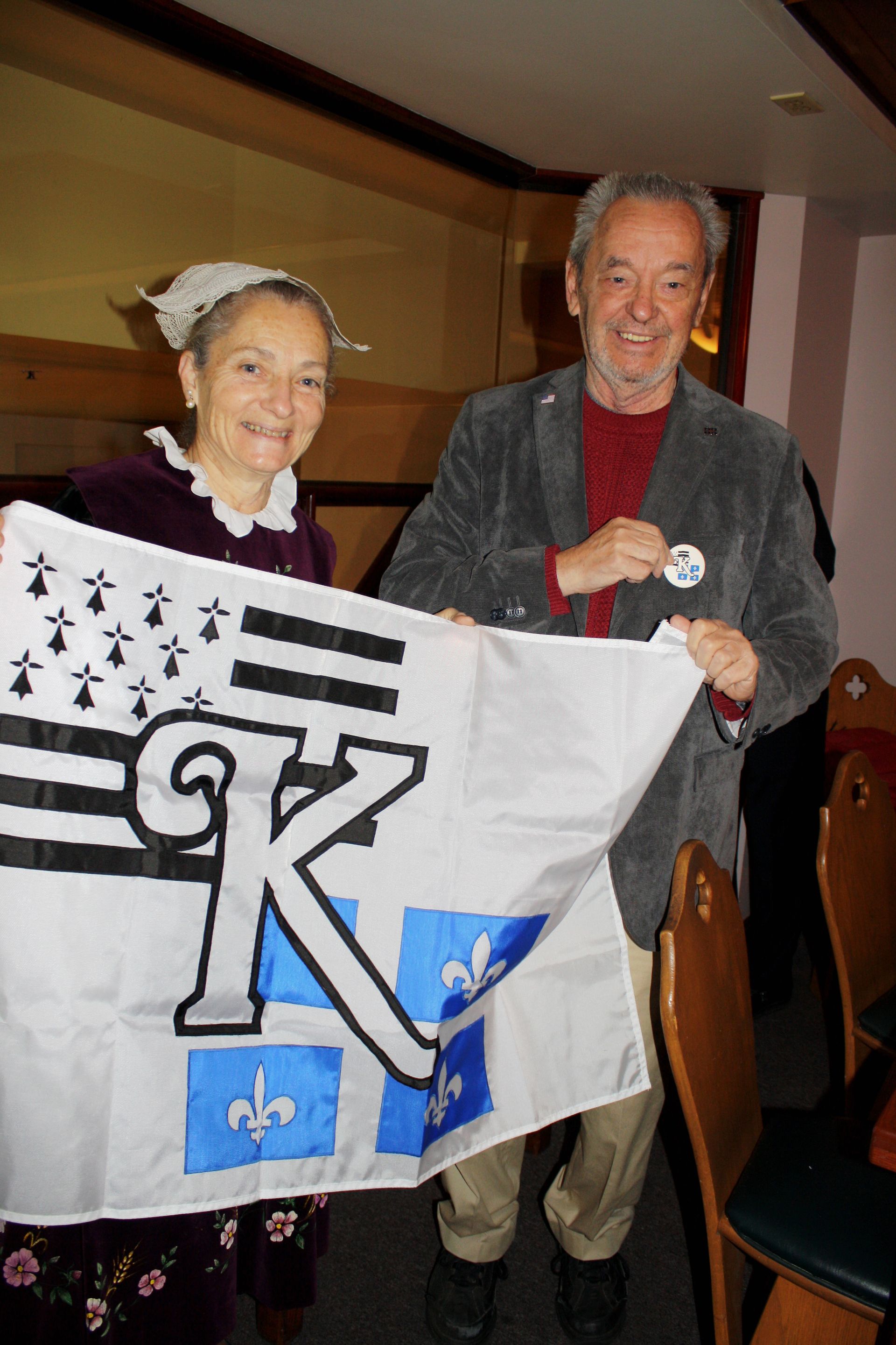Monsieur Brunelle, touché de cette marque d’amitié, exprime sa reconnaissance. Le drapeau présenté par Marie Lussier Timperley, vêtue pour l’occasion du costume traditionnel breton, et de Michel Bornais. – Présents aussi sur cette photo, Jacques Kirouac et Éric Waddell.