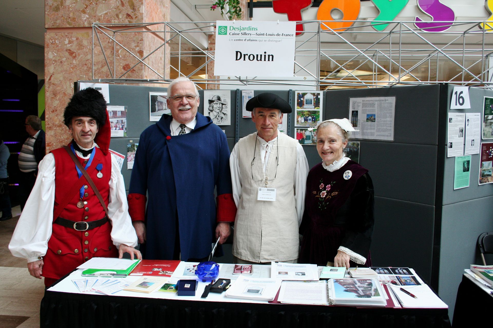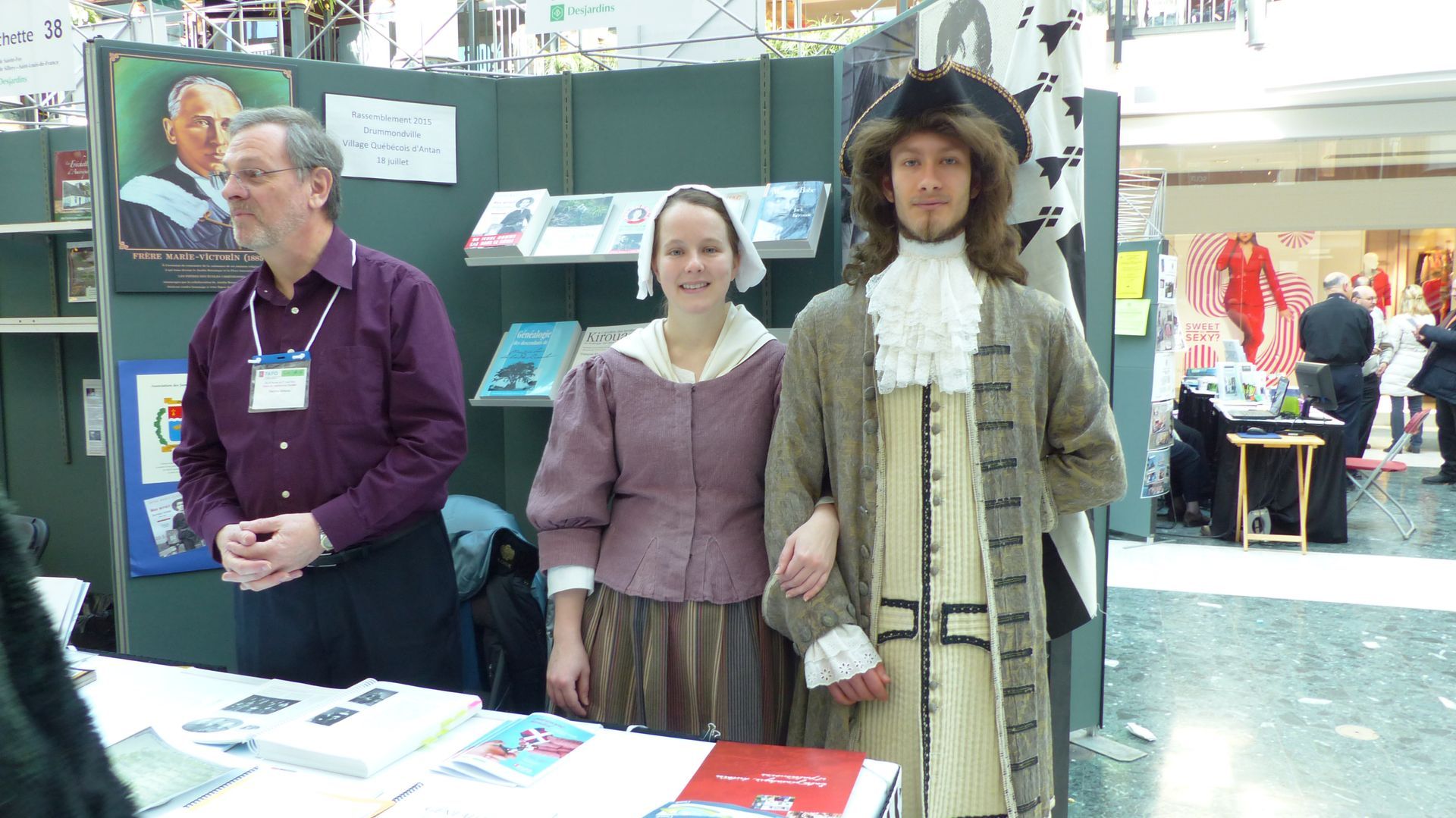 Le Salon de 2014 rend un hommage particulier aux « Filles du Roy », ces femmes appeler à juste titre, les « mères de la nation québécoise ». Ici, deux jeunes gens représentent Marguerite Lamain (fille du Roy) et Michel Rognon dit Laroche, ancêtres des familles Laroche et Rochette en compagnie de François Kirouac.