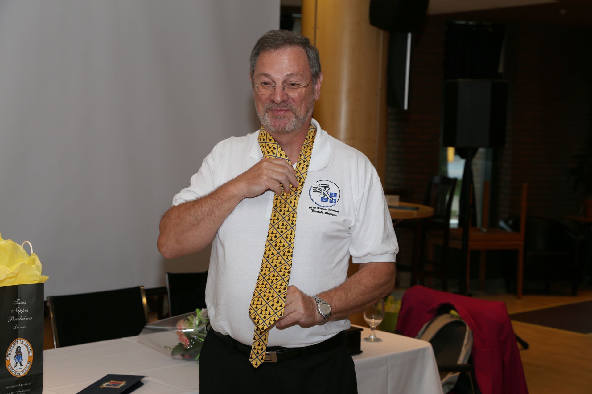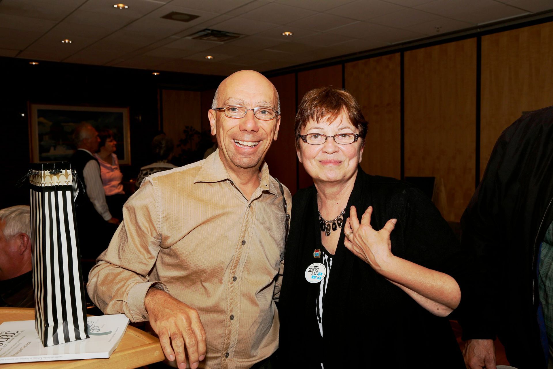Roger Brunelle, accompagné de Marie Lussier Timperley, nous montre fièrement ses insignes d’appartenance à l’Association des familles Kirouac.