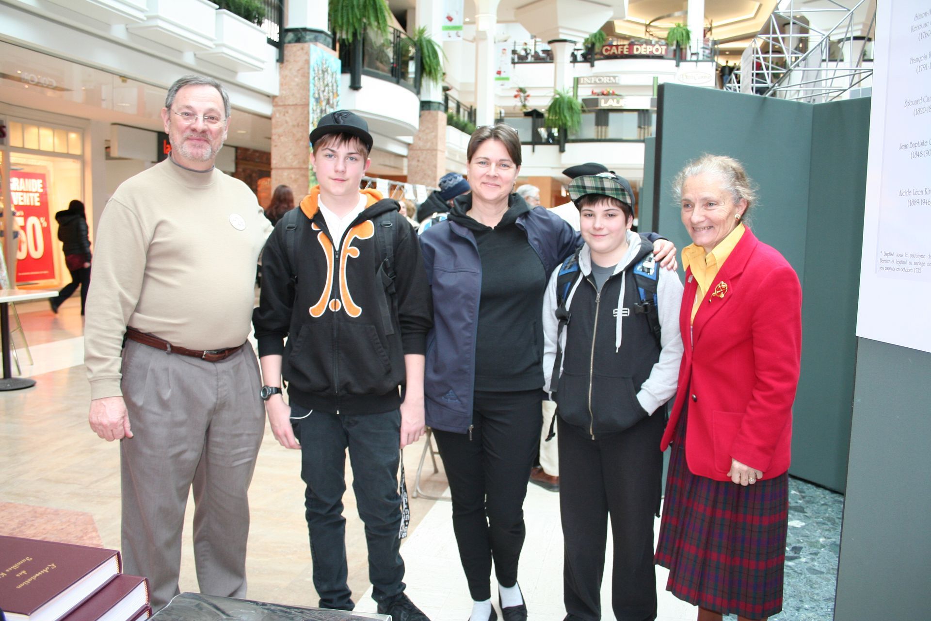 Marie Lussier Timperley et Michel Bornais, responsables du kiosque, (en avant, à droite) ont de la visite de Warwick : Denise Pépin et son conjoint, Renaud Kirouac accompagnés de leur fille Renée et leur fils Jean-François.