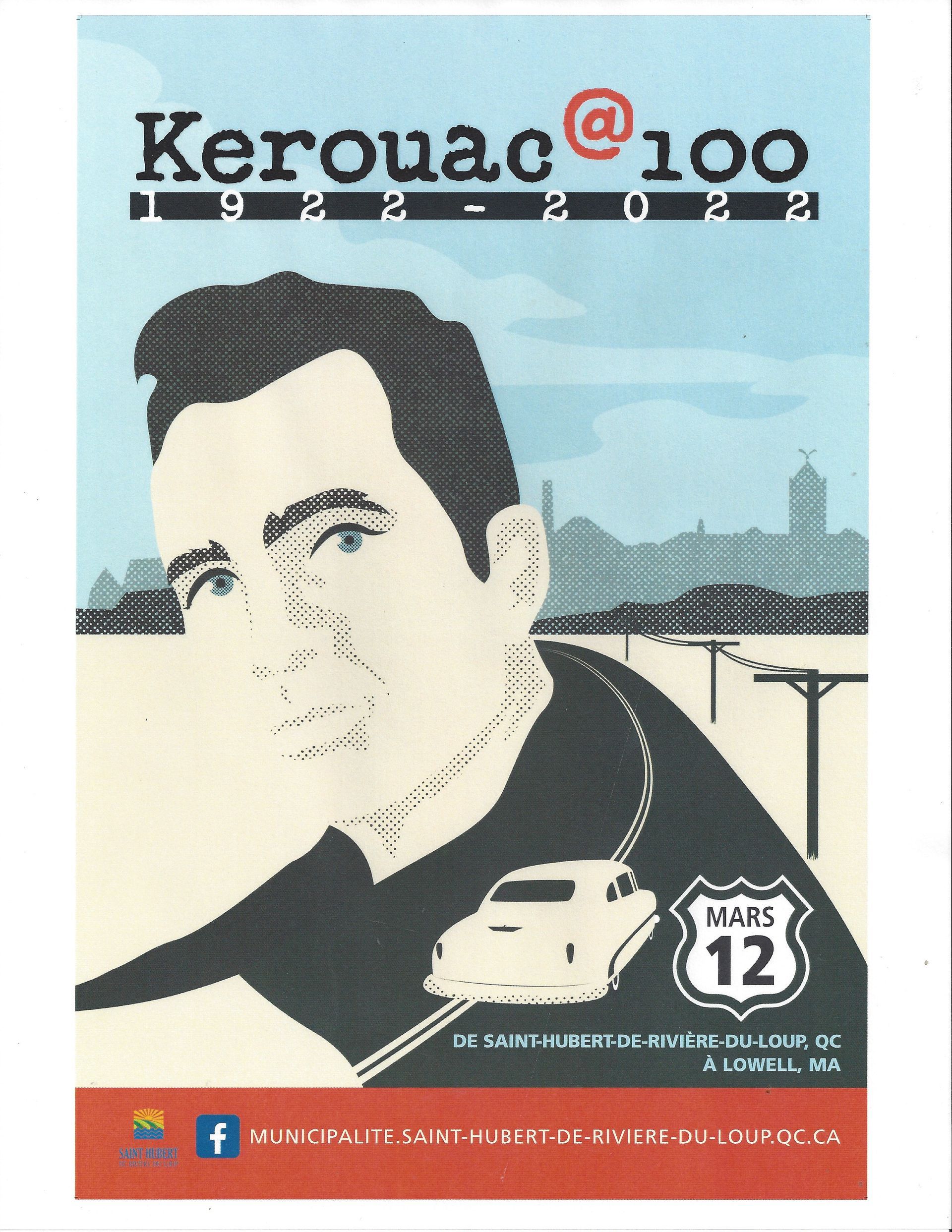 Version française de l’affiche officielle du centenaire de Jack Kerouac donnée à la municipalité de Saint-Hubert par la ville de Lowell au Massachusetts. On peut maintenant voir cette affiche sur le mur extérieur de la salle municipale située tout juste face à l’église paroissiale. (voir photo précédente)