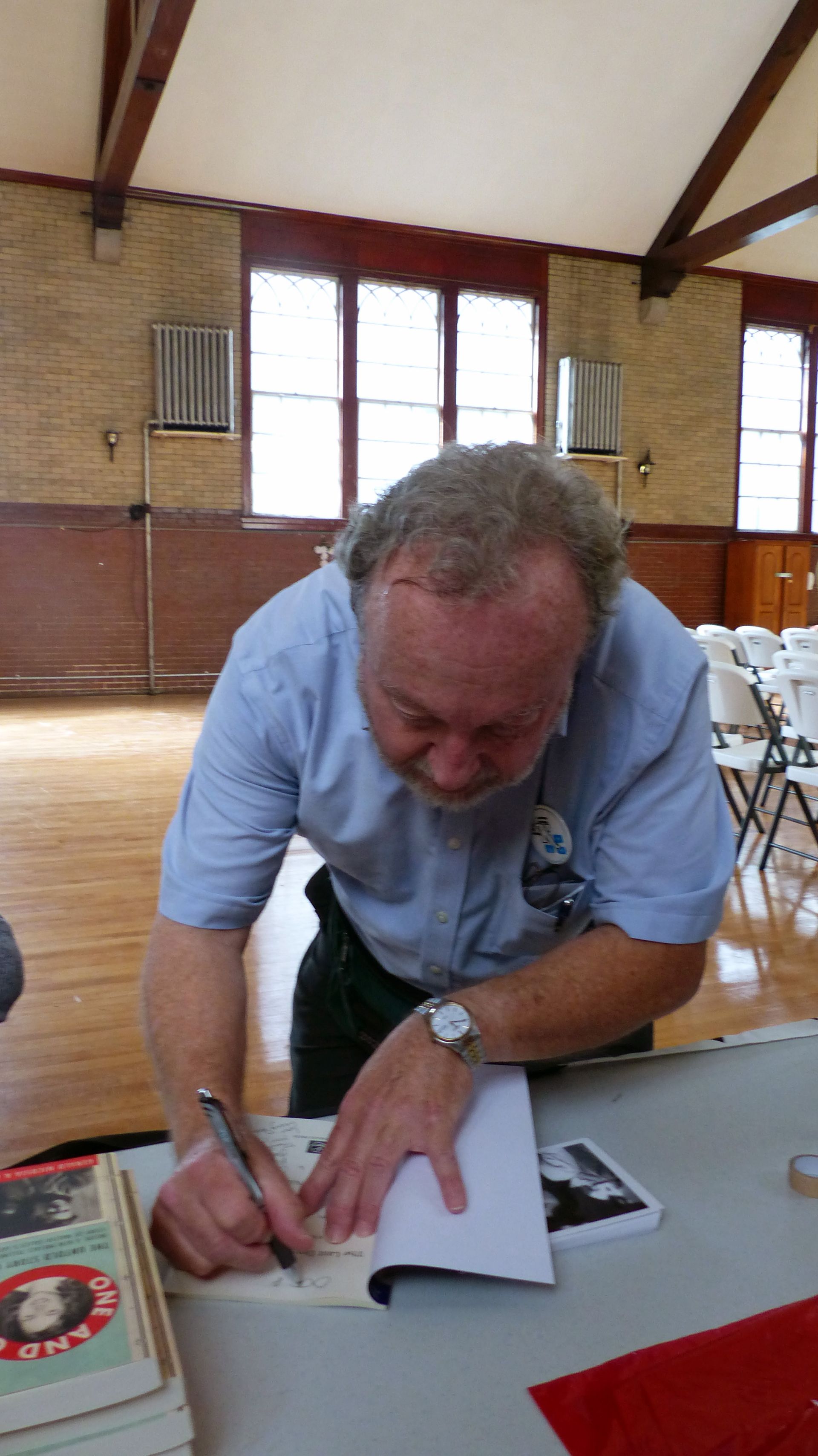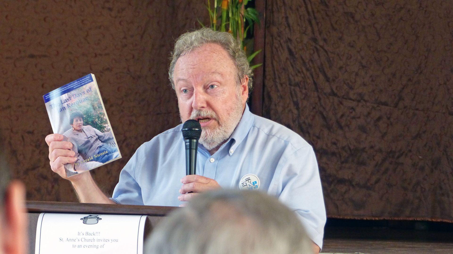Gerald Nicosia inscrivant une dédicace pour un des participants dans une page de son dernier livre, The Last Days of Jan Kerouac.