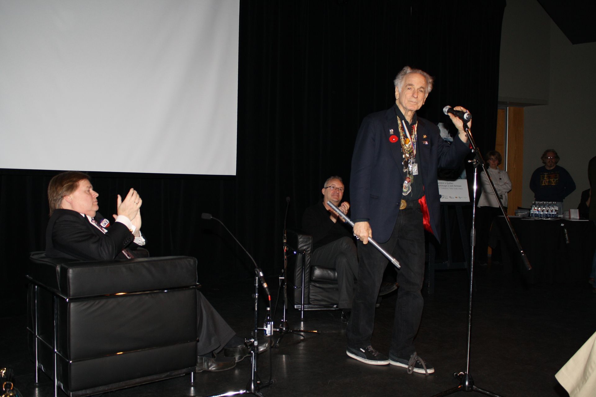 David Amram applaudit par l’animateur Robert-Guy Scully et le comédien et humoriste Michel Barrette.