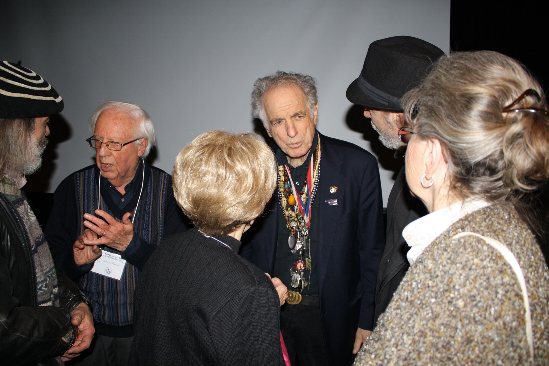Jacques Kirouac entretenant David Amram de Jan, la fille de Jack Kerouac. Ils sont en compagnie de François Kirouac et Michel Bornais.